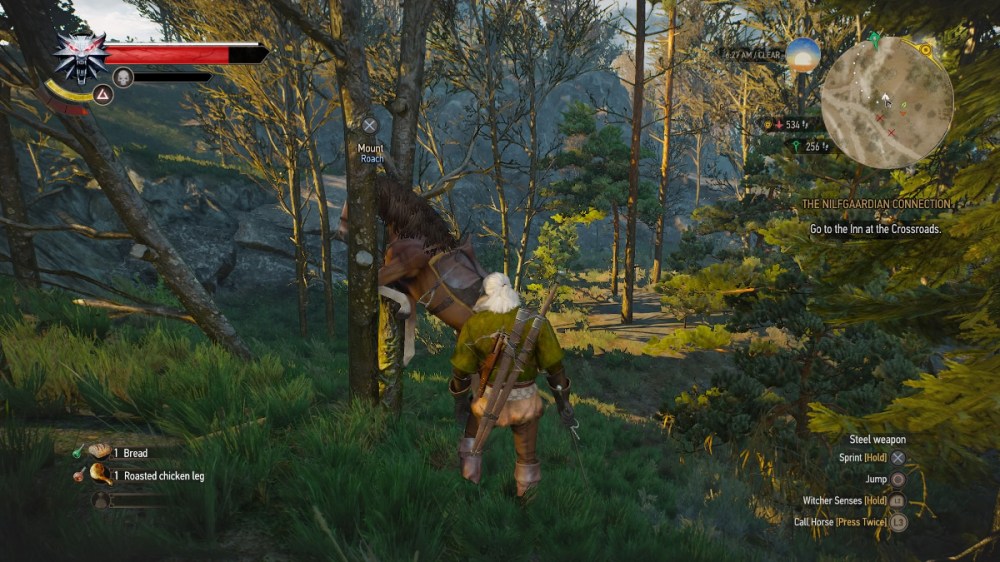 Trying to climb a mountain seems like it could be in the wheelhouse of the right kind of horse, but climbing a tree?? As I recall, I left Roach in this shady spot in Velen, went off to fight a bunch of monsters, and returned to find her in this very uncomfortable-looking state. Maybe she was bored? Maybe she saw a squirrel? Maybe she got confused? Because I know I sure was. Also, there are no squirrels in this game, so what am I even saying. I can assure you that Roach does not know, and neither do I.