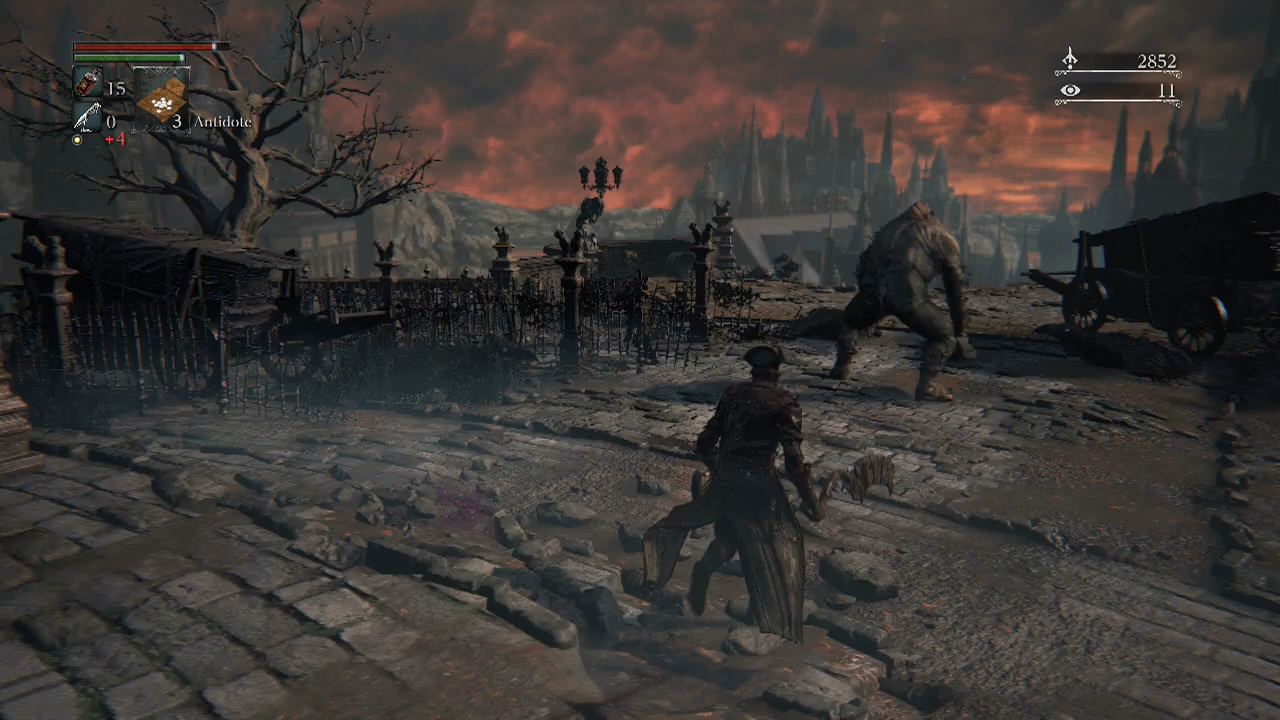 I survived the fall, a fall that I’m sure would have killed me in Dark Souls. I then carried on through Yharnam, only to die by an enemy 20 seconds later…