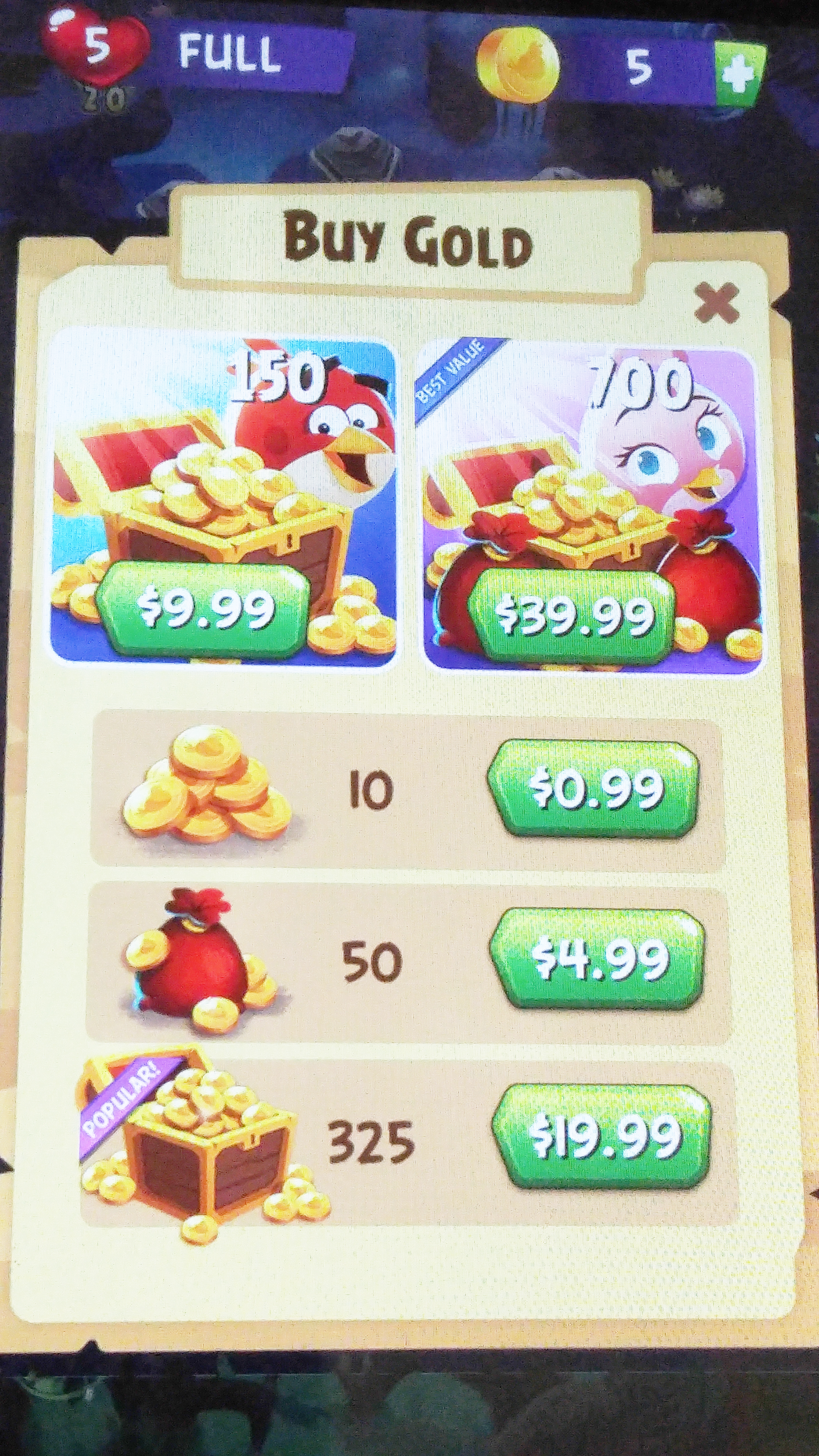 With an example of Angry Birds POP, the game is free to play however; you have 5 lives. Once those lives are depleted you’ll get timed locked out of the game until you pay to play. This is as much as $39.99 for a cell phone game mind you to continue to play. I’m not sure who is okay with that, but I’m not. It isn’t the only game that does this many others do the same or they penalize the player until they pay.