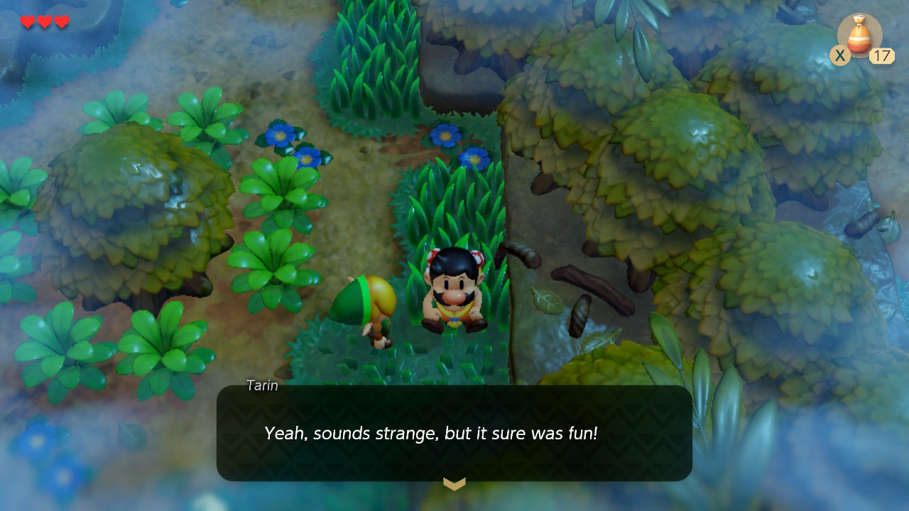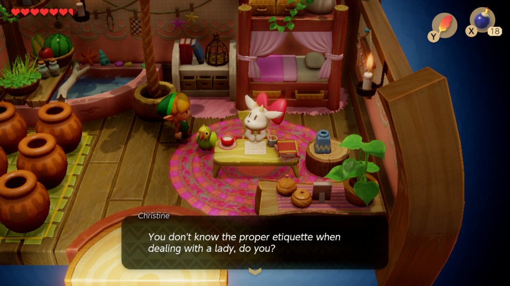 Upon first being unleashed on Koholint, after obtaining Link’s primary weapons – sword and shield – my immediate reaction to the game was the same as many. I was fully delighted by the adorable and colorful graphics, as well as taken in by the brilliant soundtrack. Between those two items alone (graphics and music), the remake definitely hit a home run. Adding to that was some wonderfully solid and responsive gameplay. Never did it feel like Link was going to accidentally slide into danger or hit something I didn’t want him to. Nope, I had little but my own poor reaction times and lacking attention span to blame for Link’s many (many) falls into various holes or run-ins with the local enemies. After having played a string of large, realistic games with poor aiming and other quirky quirks (yeah, I’m lookin’ at you Red Dead Redemption II), Link’s Awakening truly felt like a sunny day after a long-winded storm. The game’s excellent and funny dialogue, as well, certainly helped allay my fears of flailing about. Laughter is the best medicine for just about anything, after all!