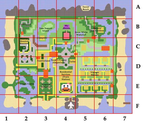 You see, I’m a big Disney fan, but I also really like the beautiful Japanese theming a lot of islands use, with the bamboo and Zen gardens and the like (I even just got a pagoda from Gulliver). So I decided that I would do a combination of both, with the left side of my island being based off of my favorite side of Disneyland and the right side being more natural and inspired by photos of Zen gardens I found online and Kamiki Village in Okami. To give you guys a better idea of what I’m planning, you can see the grid where I mapped everything out below.