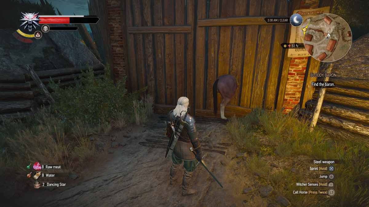 This is the first Roach glitch I captured, and I think it remains my favorite, and also probably most horrible. Because no one wants half a horse. Let alone the end facing Geralt here. But I digress. Early on in the game, I was on a quest to find the “bloody baron” in a place call Crow’s Perch, which has a winding path up to its main castle with this particular gate that opens and closes on a whim. I somehow managed to leave Roach in the wrong place at the wrong time. (She was perfectly fine upon opening the gate.) But this particular scene, funny and terrible, caused me to never bring Roach into Crow’s Perch again.