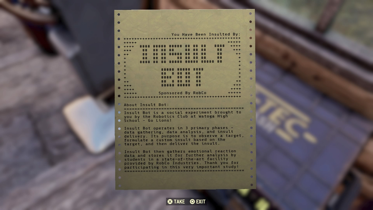 Insult Bot then gathers emotional reaction data and stores it for further analysis by students in a state-of-the-art facility provided by RobCo Industries. Thank you for participating in this very important study!