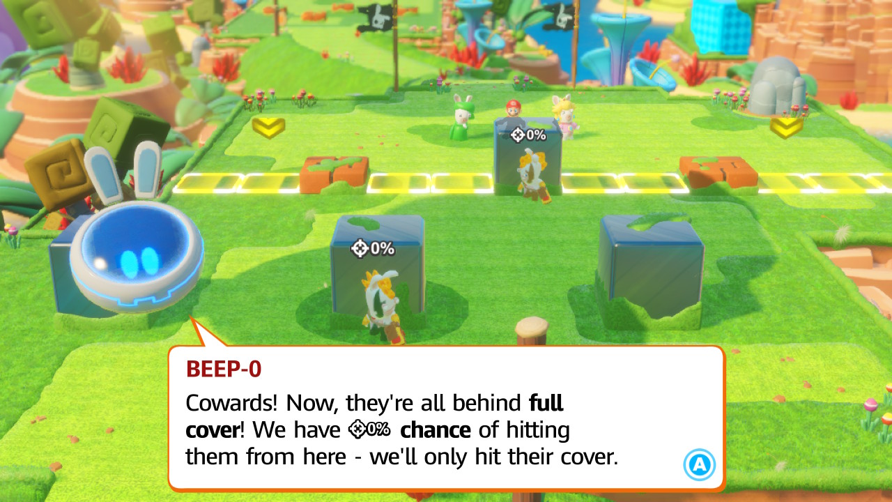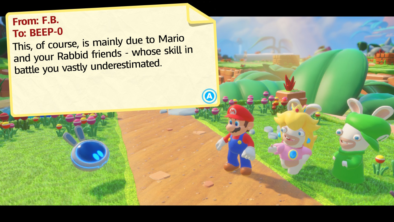Without getting into the weeds, Mario + Rabbids Kingdom Battle tells the story of two worlds that become accidentally merged no thanks to the ever-mischievous Rabbids. After time-traveling their way into the room of a young inventor and world’s biggest Mario fan, one of the Rabbids toys with the inventor’s newest contraption. Called the SupaMerge helmet, it can merge two things into one. Things go utterly berserk when the Rabbid puts on the helmet and starts merging other Rabbids with everything in sight. The fabric of time and space is ripped apart, and everyone ends up in the Mushroom Kingdom, where the little Rabbid with the SupaMerge helmet continues to merge things uncontrollably. Eventually, the SuperMerge Rabbid is scooped up by the Bowser family, because, of course. Our old pal Mario is tasked with making things right again in the messed up Mushroom Kingdom. Helping him are merged Rabbids – Rabbid Peach, Rabbid, Luigi, and I just opened up Rabbid Mario (whee!) – along with his regular cohorts. (For now, that means only Luigi, but I assume other characters will join in the fray at some point.) Joining Mario and his crew is an adorable and forthright robot named Beep-0, formerly the young inventor’s assistant until getting swept into the Rabbids’ time vortex, who serves as something of a guide, narrator, and mover of blocks and other obstacles. There’s also a mysterious someone called “F.B.” who sends messages to Beep-0 when Mario needs help the most, or just to give out nice compliments.