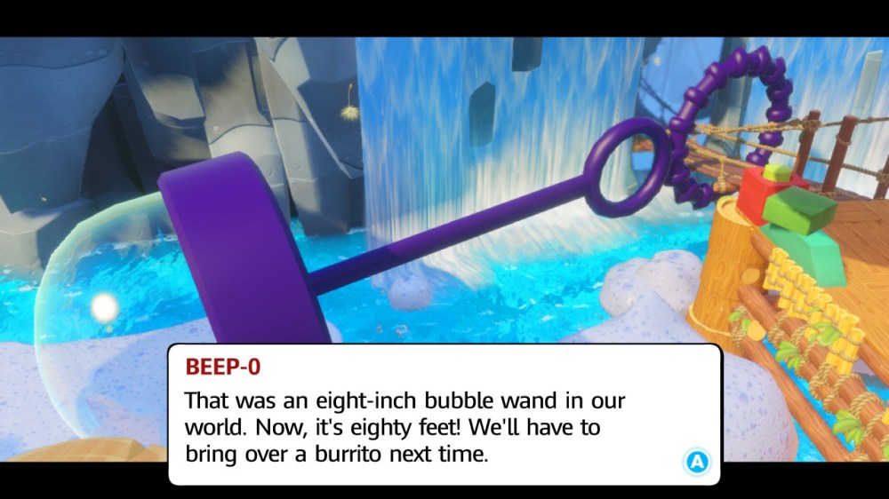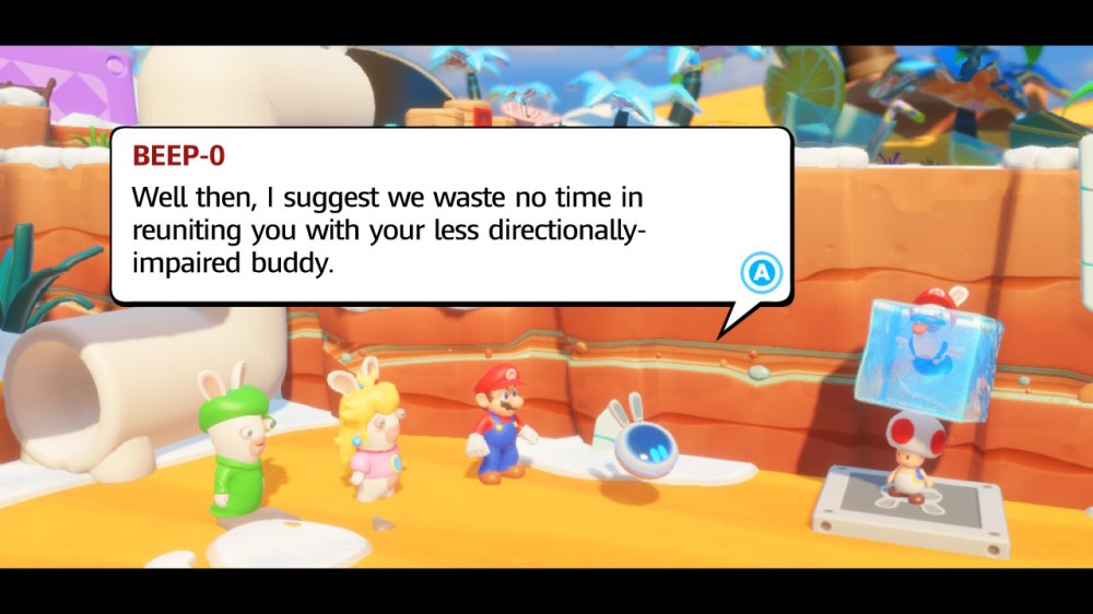 Within each world, there’s more to do than just battle Rabbids. While there is a set path that leads from battle to battle, including mid-bosses and final bosses, there are puzzles to solve, secret areas to discover, coins (gold, red, and blue) to gather, and collectibles to unlock. In addition to leveling up the team itself (thanks to orbs that are won in battle), the always-present Beep-0 learns different skills during the journey and uses them to help the team progress. And I just recently learned that when Beep-0 acquires new skills, the team can return to previously-beaten worlds to access certain closed-off spots. The worlds themselves – speaking only for the Ancient Gardens (World 1) and the Sherbet Desert (World 2) – are vivid, colorful, and very inviting. Each environment blends the bright, tactile landscapes associated with later 2D and 3D Mario games with the Rabbids’ playfulness and goofy sense of humor.  And the artifacts of each world are amalgamated in the most entertaining ways. While each world contains branching paths, there’s no open-world exploring or bouncing around from one place to the next, as Mario and his team are forever set in a follow-the-leader configuration with Beep-0 always in the lead.