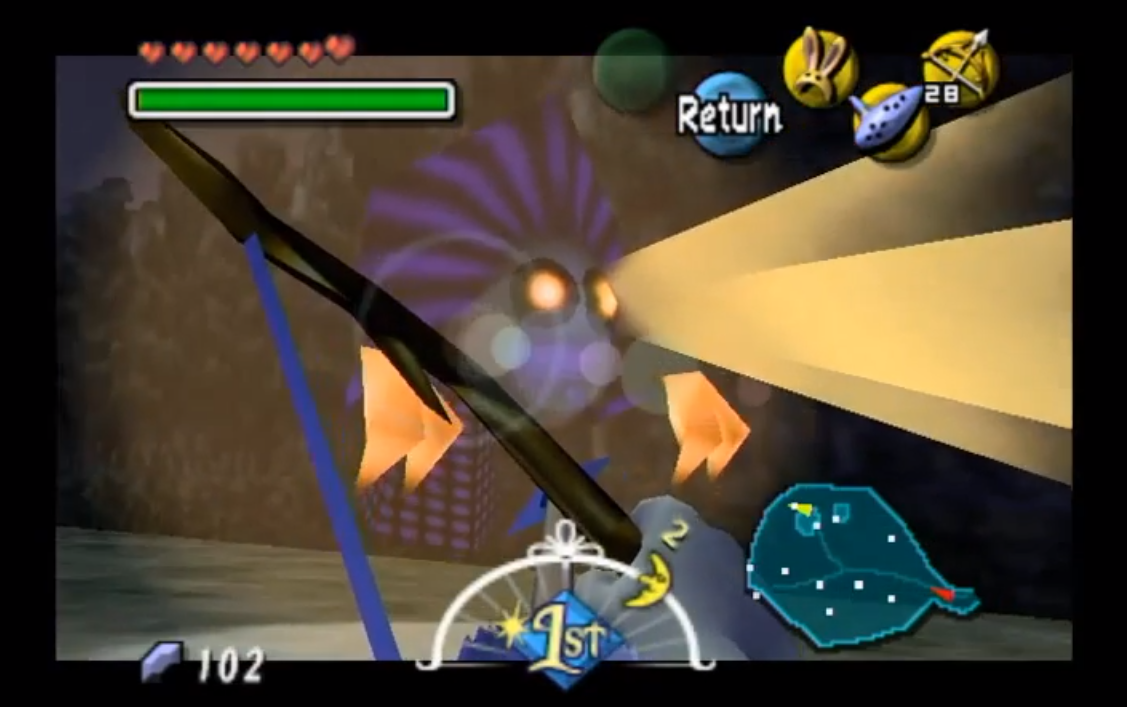Duck: Leave it to Majora’s Mask to feature three masks where you transform into dead people, the Deku butler’s son, Darmani the Goron hero, and Mikau the Zora guitarist respectively. These masks grant Link unique abilities, such as rolling around at high speeds and heightened strength as a Goron and excellent swimming abilities as a Zora (along with the Deku Mask’s abilities, which Cary recounts below). Not only is this a cool game mechanic, but it never occurred to me until recently that, at least in the case of the Goron and Zora Masks, you are actually fulfilling the previous “owner’s” dying wish, so to speak. By saving the Gorons from the blizzard coming from Snowhead and rescuing Lulu’s eggs from the pirates, you’re actually finishing the very goals that got Darmani and Mikau killed in the first place…