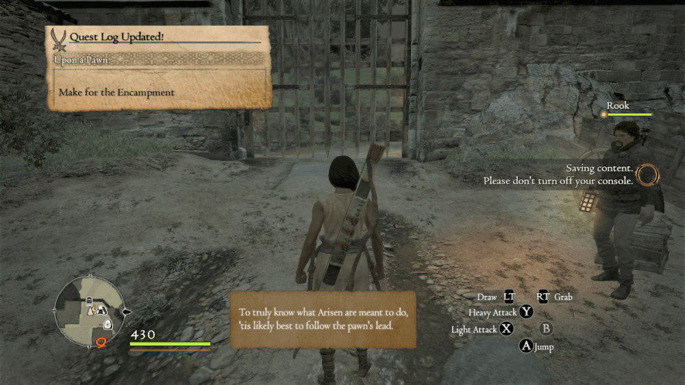 For my first jaunt as the Arisen, I created Corinne, a strider, a class that uses a bow and arrows for ranged attacks and daggers for close combat. As I mentioned, the character creator was incredible and almost overwhelming as to how much customization it offered. (I could have easily spent more hours than I have actually played so far just picking and choosing various features!) Once Corinne was set loose in the world, the game wanted her to head to a nearby encampment, but of course I had to spend time getting to know my home Cassardis. In roaming around the town, I picked up a couple random quests and realized that quest management was going to be a…thing. Same went for general inventory management. To a degree, it reminded me a little of The Witcher 3, what with the number and variety of inventory slots I had at my disposal. Equipping new items seems easy enough; consuming items seems tricky. As with any new game, there’s always a learning curve at the beginning. We’ll see just how long it take me to get over the hump in this game, so to speak.