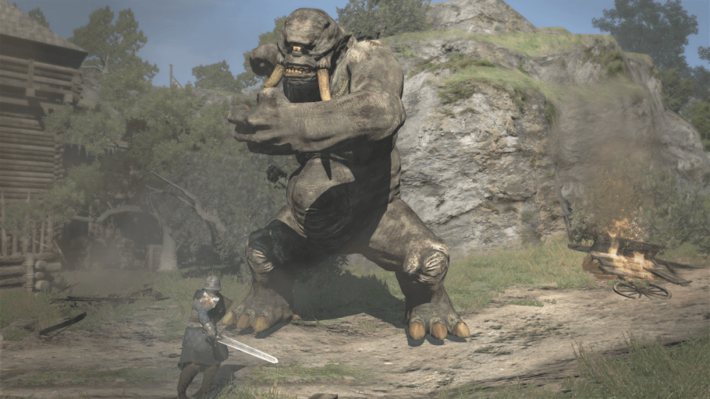 After unceremoniously dying several times, mostly to stray wolves, Rook and I finally reached the marked encampment…only to find its soldiers battling a cyclops! At least I think that’s what it was. At the very beginning of the game, which I imagine represented its end in some manner, I was thrust into the Arisen’s shoes as he took on enemies galore, including a very intimidating Chimera. From that battle I gathered one of the game’s unique combat mechanics, that of climbing onto an enemy to attack it. (Very Shadow of the Colossus, no?) Upon meeting up with the cyclops, that was one of the first things I attempted. And it worked! Can’t say my rusty daggers did much but poke at it, but I had a grand time in the fight nonetheless. I had the feeling at that point that, if nothing else, at least I was going to get my money’s worth in this game with exciting monster fights.