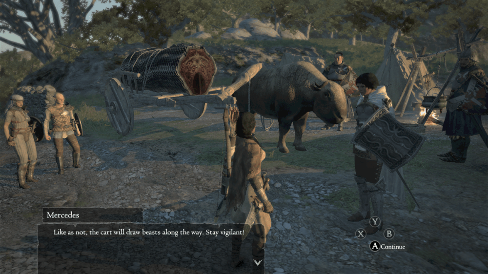 Before heading out from Cassardis, Corinne had one other important task – to gather a companion known as a “pawn.” As I understood it, this was an offering that made Dragon’s Dogma stand out from other RPGs with companion systems; as such, I was highly interested in seeing just how the system worked. I was given a fellow named Rook, and I can’t for the life of me remember what class he was, but he happily followed me as I set off from Cassardis for whatever encampment lay off in the distance. Traveling along the roads led to some interesting, um…learning opportunities. For example, Rook talked, quite a lot at times. But, his words often provided clues as to what I was (and wasn’t) supposed to do and where I was (and wasn’t) supposed to go. Rook also looted on his own, which I found interesting, and would immediately head into battle upon seeing any enemy. Speaking which, I found my footing well enough with combat, but I was a little dismayed at how quickly I encountered mobs of enemies. Not that I was expecting an easy go of things, but as I was traveling at night, and fighting in the dark was just confusing to begin with, I wondered if the game might be one of those where nighttime encounters differed from daytime ones. Add that to the growing list of discoveries to be made!