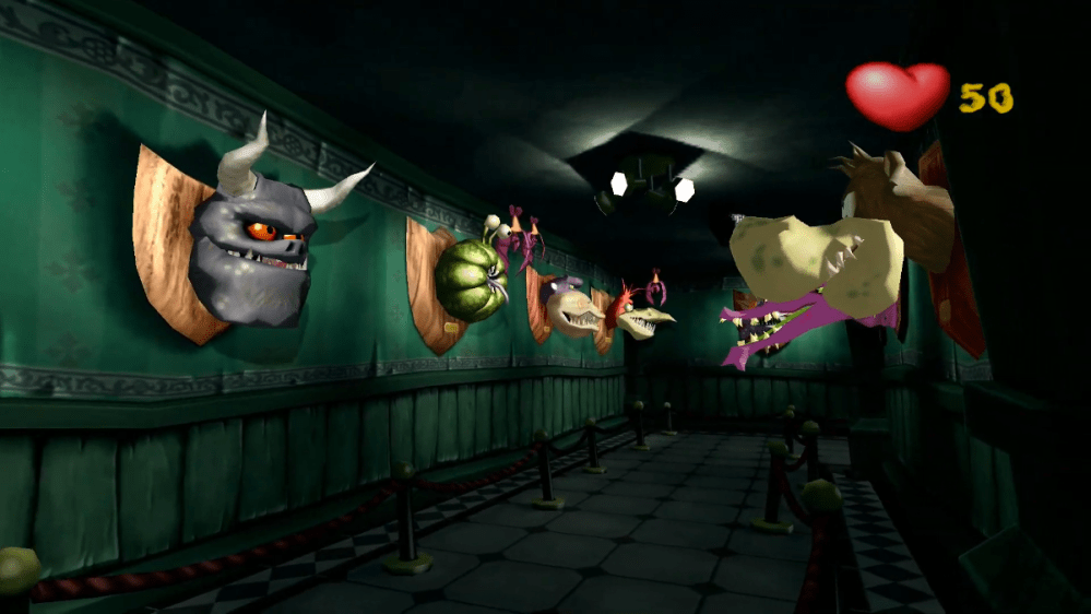 Mounted animal heads are creepy, and that’s a fact. Grabbed by the Ghoulies shows off their own twist on such trophies, as they make players maneuver Cooper through a twisty hallway that full of mounted heads, which include very menacing versions of Rare’s beloved mascots, Banjo and Kazooie! As Cooper treads lightly through the very creepy hallway, the occasional heads pops out of the wall to give him a “super scary shock,” introducing one of the game’s mechanics involving a series of button presses to calm down Cooper. It’s all very silly, and yet it’s quite effective at showing players what to expect as they delve further into the game. Scaring Cooper too much and failing to calm him down results in some very unfortunate consequences. It doesn’t help that scares lurk around every corner, but encountering them and defeating them is all part of the goofy fun of this goofy game.
