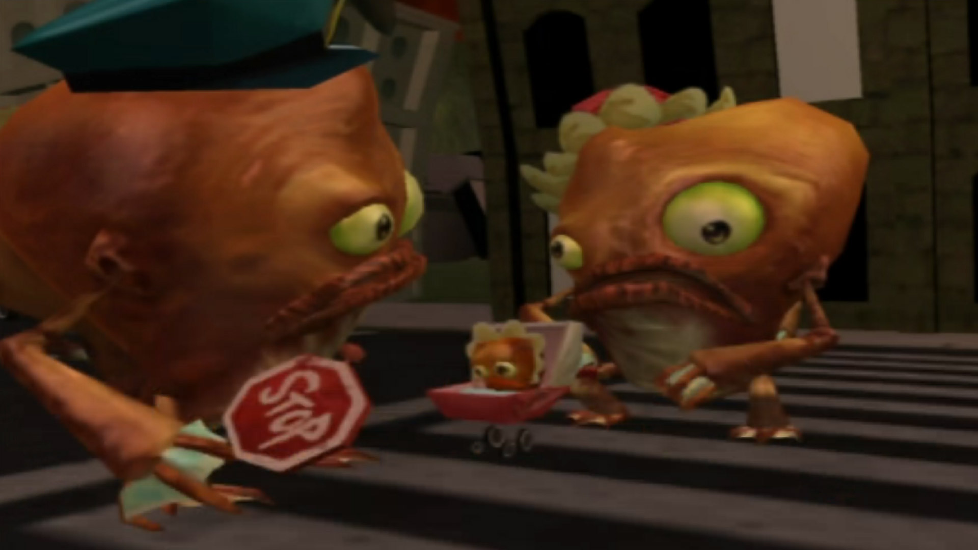 After the fight ends in Raz’s victory, we learn that the lungfish, who goes by the name of Linda, was actually mutated by the diabolical dentist and scientist Dr. Loboto and is being mind controlled to do his evil bidding! Poor little thingβ¦ And so it’s up to Raz to enter Linda’s mind, which manifests as a city inhabited by lungfish living regular human lives, while Raz himself appears as a giant monster!