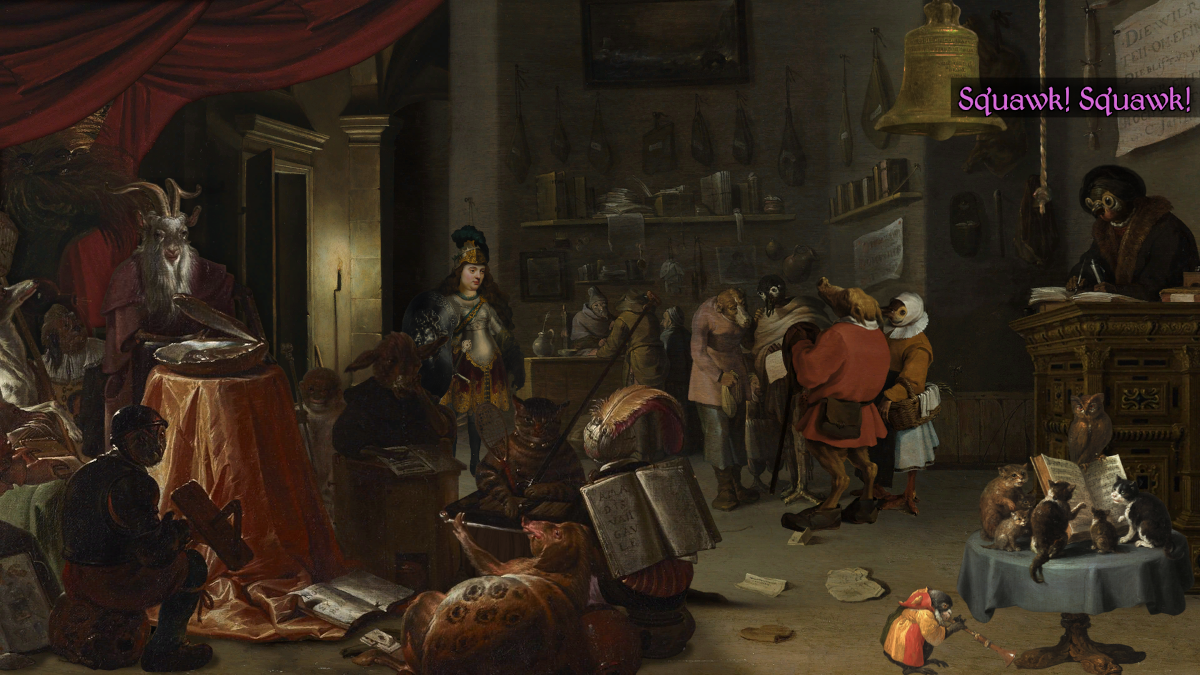 The Procession to Calvary is a game that’s best seen rather than described, but I’ll do my best. It’s animation is essentially a cut-and-paste pastiche of paintings from the European Renaissance. Think: knights in shining armor, popes and priests, peasants and scribes, cherubs and gargoyles, religious scenes, circuses, and devilish depictions of the unknown. No doubt much on view in the game is familiar to European art historians; for me, its scenery and characters were adorably strange, funny, and downright odd in several cases. Players take the reins as a knight tasked with finding Heavenly Peter, a tyrant of the worst kind. (Not that there’s such a thing as a good tyrant, but I digress.) By traversing the game’s world and interacting with its scenes and inhabitants — pointing and clicking away at anything and everything — the knight seeks her revenge! And she gets in a few good laughs along the way, too.