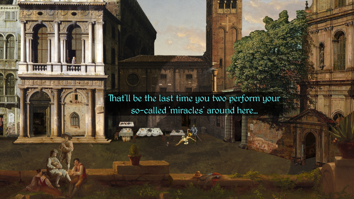 Save for a delightful soundtrack full of Renaissance-era tunes, The Procession to Calvary is a silent game. Conversations take place via text that pops up when moving the cursor over a character. It’s a mechanic that works fine, and as such, players can easily re-read any text in any scene as needed. If I have but one qualm with the game, it’s the language. Not that it’s bad per se, but its modern cadence grows old quickly. When the game first came out on Steam a couple years ago, I recall reading an article that compared its style to Monty Python and the Holy Grail. That inspiration is evident in the game, and some of the language does reflect its script. But much of it reads like bad farce. It’s too self-aware, too irreverent for its own good, especially in scenes that featured religious motifs (which, frankly, is a bulk of Renaissance art). Some of it is also poorly written. After a while, the language just took me out of the game, and it made me rush to the finish line because I was tired of reading bad grammar rather than savoring the game’s better nuances.