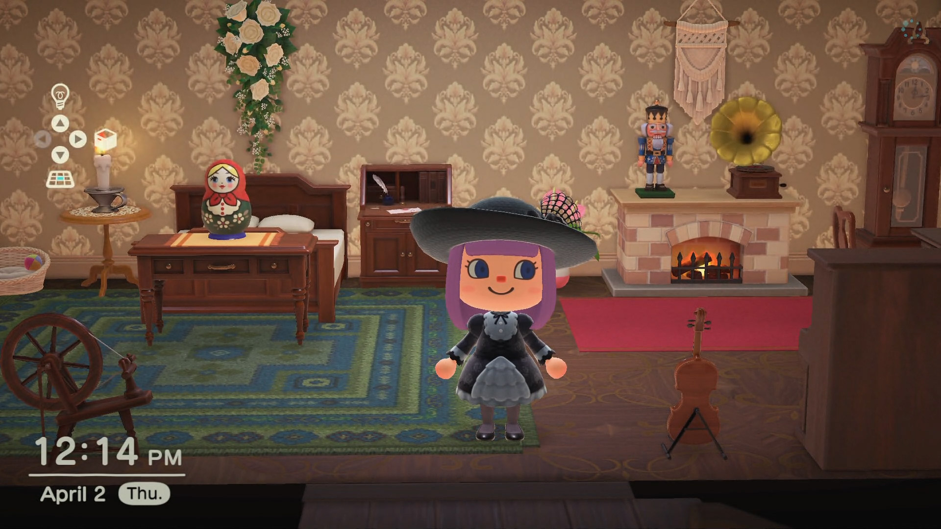 - My Animal Crossing: New Horizons House – If I may say so myself, I think my charming abode on the island of Quacksville is quite a relaxing place to rest one’s soul. Probably my coziest room would be the bedroom upstairs, where I have a little sitting area off to the side, along with…you guessed it, a fireplace! (Unfortunately, I failed to take a screenshot of this room with this layout, so please enjoy this older picture…) It becomes even more inviting when surrounded by the Falling-Snow Wall, which includes countless windows showcasing snow-laden trees and mountains in the distance!