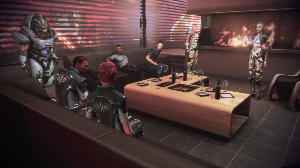 I’ll admit that “cozy” did not fall into my first impression of Admiral Anderson’s-turned-Shepard’s apartment in the Mass Effect 3 DLC, Citadel. After all, the place is massive! Two floors, lots of room and space to spread out, it seemed the definition of luxury, if nothing else. But then Shepard’s crew arrived for some well-earned time off, and the place transformed. Its large rooms became much more intimate with the addition of crew members just being themselves. Relaxing and chatting, eating and drinking, playing cards or relaxing in the hot tub, a very good time was had by all in a space that could have remained rather uninspired otherwise. After good time with good people, that apartment became the coziest place on the Citadel!