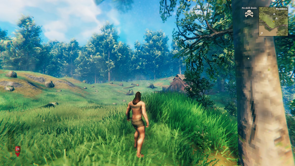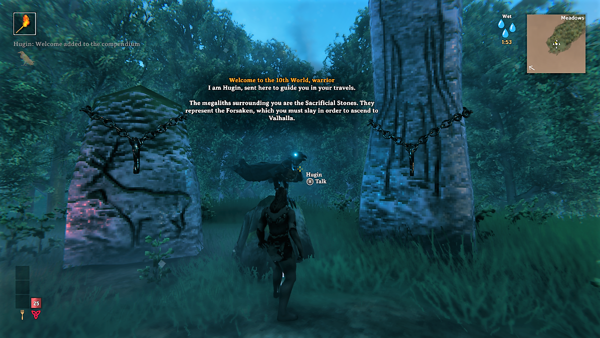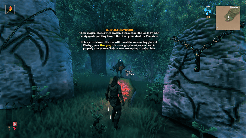 To call my first hour or so in Valheim “embarrassing” would be an understatement. While a small part of me would have been happy to have some support from other players – Valheim can be played solo or with up to ten people – I was mostly okay that no one was around to see me fail so heavily at learning the ropes. As I said, I went in Valheim with very little know-how, so the basics of survival games, like punching trees for wood and animals for food and leather, evaded me at the beginning. Instead, I wandered around gathering branches and berries, and I avoided just about anything that moved. Action in the game was mostly self-directed, but thankfully, there were also guides, of sorts. For one, a raven named Hugin was my greeter, and it explained the basic premise in the game’s beginning region called the meadows – I was to prepare myself to battle with the first of Odin’s enemies, Eikthyr. As well, scattered round the world were guidestones that provided useful information about the land and its creatures.