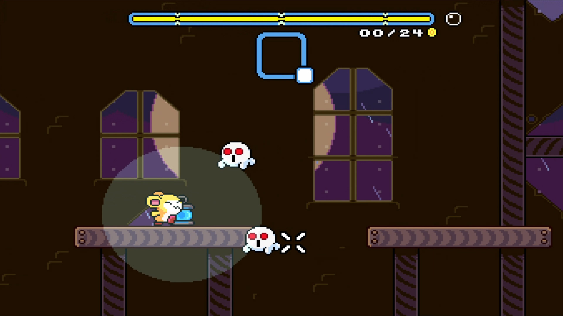 The demo is quite generous and covered a whopping 8 stages, not including the tutorial and a boss fight against one of the pirate kitties. Much of this time was spent creating a pathway for Pompom as he ventured obliviously forward, seemingly unaware of the dangers ahead. And for such a cute game, I’ll admit that I got a bit stressed trying to stop Pompom from falling to his doom. Sure, you can pause time in order to place platforms with more precision, but you can’t do this indefinitely, meaning you still need to make decisions quickly. The good thing is that the game is somewhat forgiving when you make mistakes, as every checkpoint gives you a bubble that allows you to survive your death just once and redirect Pompom to a safe place somewhere else on the screen.