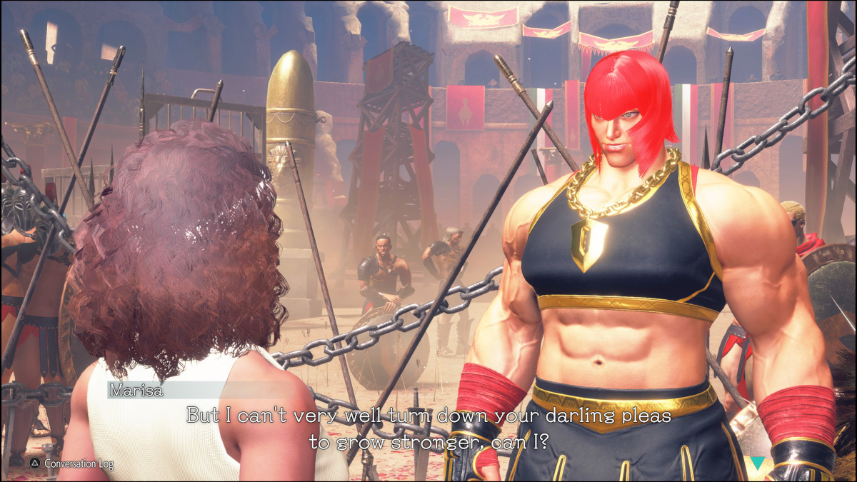 New to this SF iteration is Marisa, a purveyor of pankration, a fighting form dating back to ancient Greece. She was wholly a joy to be around, very funny and honest in her opinions of people, places, and anything else she felt like discussing, such as the art of jewelry-making. A big, gorgeous necklace with a lion emblem was her unique gift, which made perfect sense. Not only did it put her love of jewelry on display, but when you first meet Marisa in the game, you also meet her formidable companion – a giant lion named Lucius! With the necklace, now Lucius is always close to her heart.