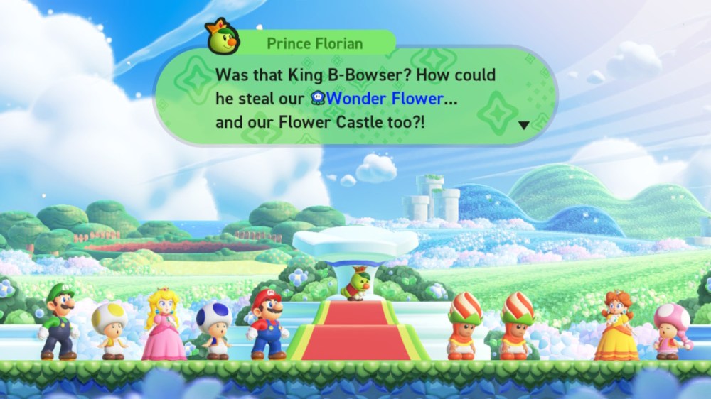 In Mario’s latest romp to save a world in trouble, he and all his friends find themselves in the Flower Kingdom. Invited there by its kindly ruler, Prince Florian, leader of the Poplins, the kingdom is a place and peace and tranquility, until Bowser appears and takes over its castle. Well, “takes over” is putting it lightly, when, in fact, he becomes the castle! Indeed, with lackey Kamek’s magical assistance, Bowser lifts the Flower Kingdom’s castle from the ground, fuses with it, and sets up shop as an airborne fortress, guarded by six Cloud Piranhas, waiting for his moment to strike.