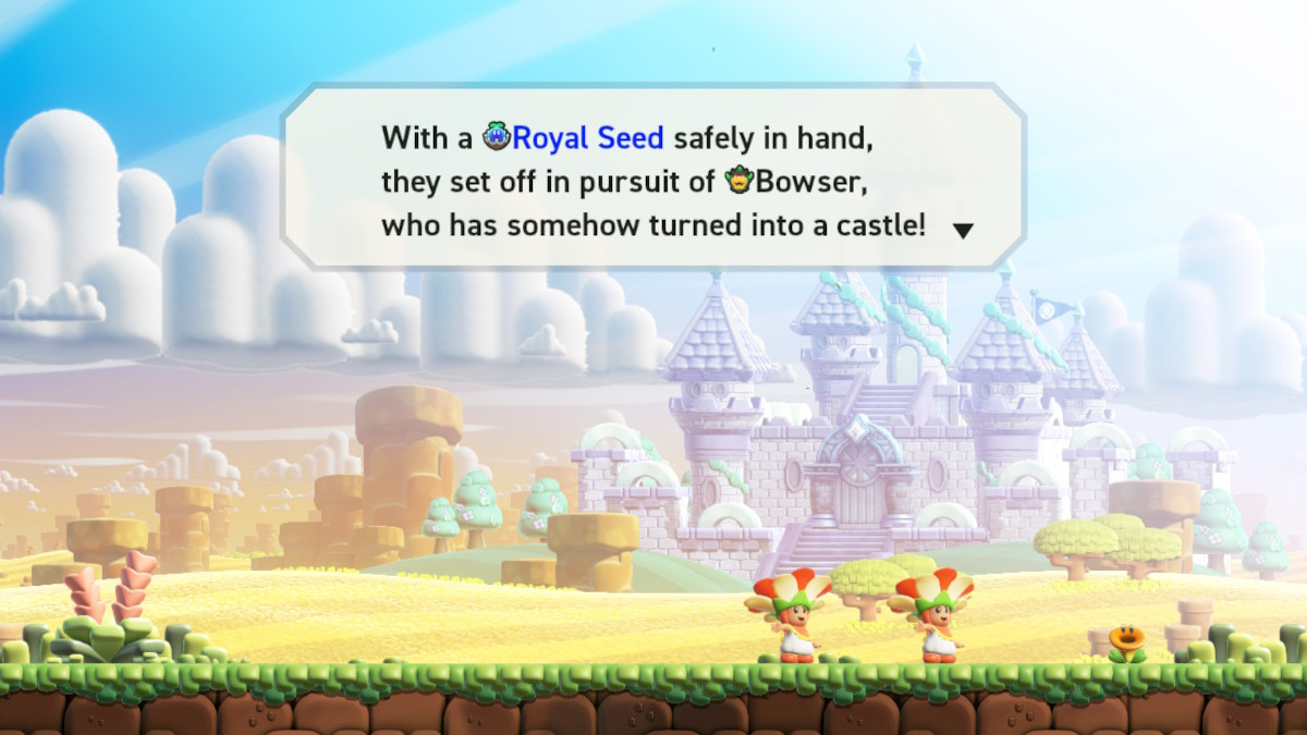 Being the gentleman he’s known for, Mario agrees to help Florian regain the Flower Kingdom and defeat Bowser. Together they set off to the kingdom’s various lands to collect the necessary items that will give them access to Bowser’s fortress. Along the way, they’ll also collect coins, various power-ups, badges, Wonder Seeds, and, most notably, Wonder Flowers. These flowers are where the “other dimensions” come in, as obtaining one alters the fabric of and sometimes the characters in its level in some fantastical way. While Wonder Seeds and Wonder Flowers are in regular levels, reaching each worlds’ castle is paramount, as they contain Royal Seeds. As Mario and Florian discover, these Royal Seeds eliminate Bowser’s Cloud Piranhas, meaning they have to retrieve all of them (six total) in order to get to Bowser. Adding to the main goal to remove Bowser from the Flower Kingdom are a side adventures to rescue trapped Poplins and gather extra Wonder Seeds through tests of skill. Altogether, there are plenty of things to see, do, and stomp on in the Flower Kingdom.