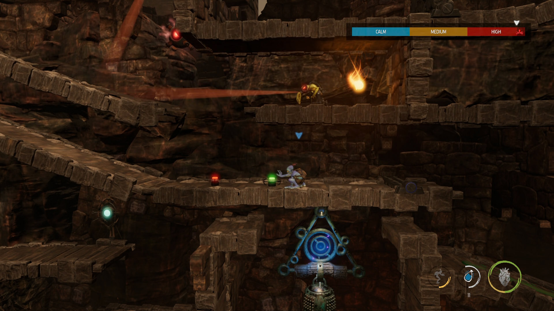 The demo for this side-scrolling adventure took me roughly 1.5 to 2 hours to complete and featured two levels, The Raid on Monsaic and the much longer Ruins level. The first level is mainly a typical platforming level, though it’s frequently slowed down by the need to start and put out fires with bottles of flammable green stuff and water respectively. The second level features lots of stealth as we avoid creatures called Sligs, which is not usually my thing, but at least it provided some interesting options for progression.