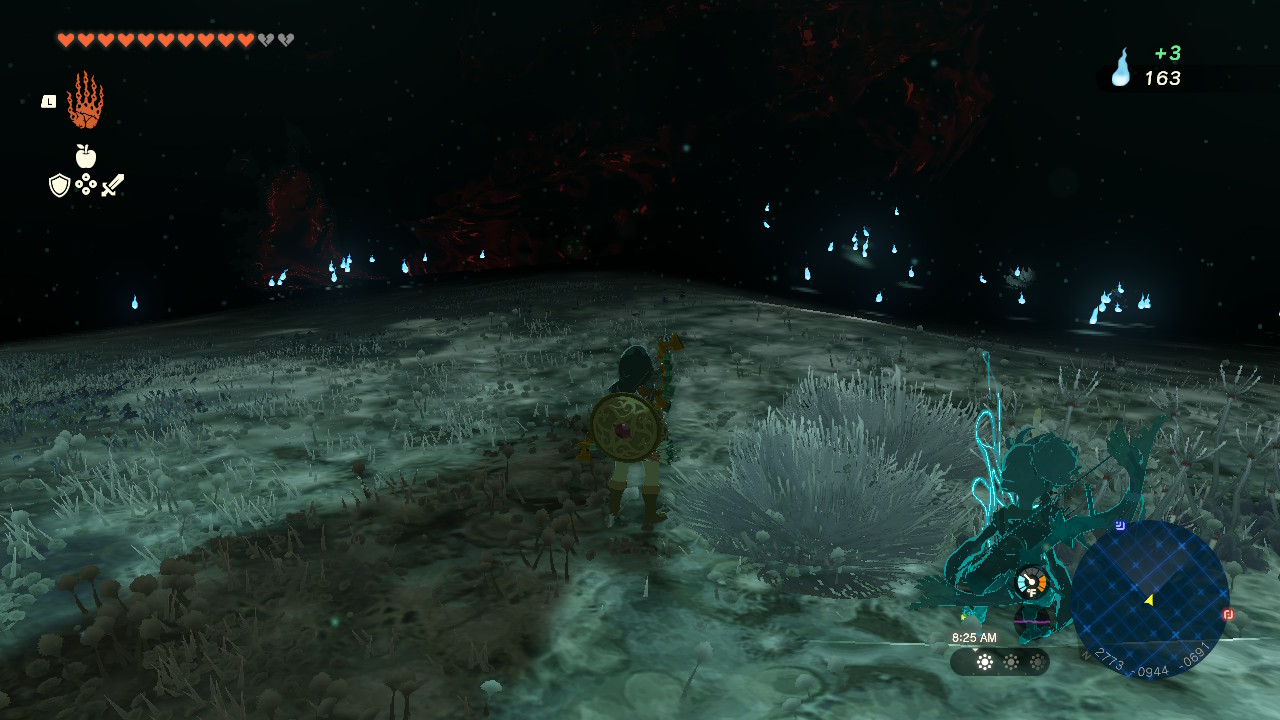 I explored the Depths bit by bit throughout my adventure, and every time I returned after a long time above ground, it would take a while for me to not feel utterly creeped out. Some highlights for me were the time I had to traverse a narrow, water-filled passageway on a raft (darkness AND water is not a good combo). And I’m pretty sure I remember a time where I committed to climbing a very high cliff. The brightbloom seeds I had left only went up so far, so eventually, I was just climbing up a pitch black wall, eating foods to replenish my stamina and hoping I’d eventually reach solid ground! I was so relieved once Link was on solid ground again. The Depths were just never a pleasant place to be!