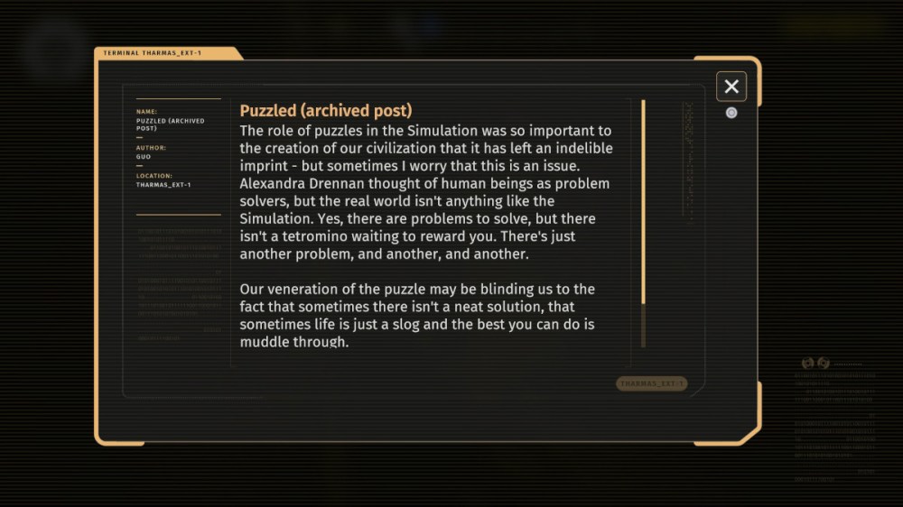 SPOILERS from the get-go, while my complaints about The Talos Principle 2 are mostly minimal, when I discovered late in the game that I could not return to New Jerusalem, essentially the game’s “home base,” before reaching the endgame, I felt decidedly sour. If something or someone had indicated a point of no return earlier, I completely missed it. This is not really a knock against the game but just a warning for potential players. Make the most of the time you have in New Jerusalem, because at a certain point, you won’t be able to go back!