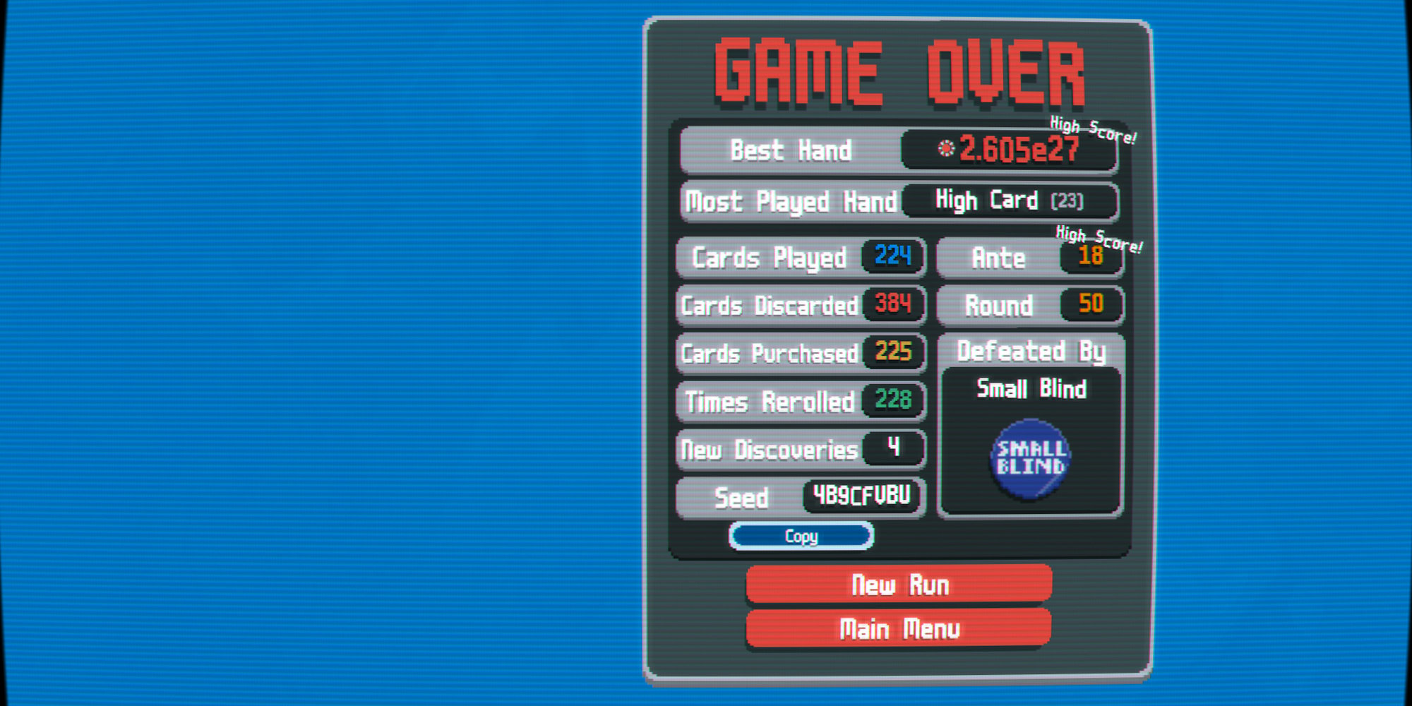 Second, going after these trophies has, in fact, caused me to spend more time with the game and enabled me to get better at it than I otherwise would have. I’ve found cool synergies between different jokers, learned tricks for dealing with certain boss blinnds, optimized my early game and have learned more or less how to play most hands and how to buid the deck around them. I’ve even managed some crazy high scores. That, I must say, has been a real positive.