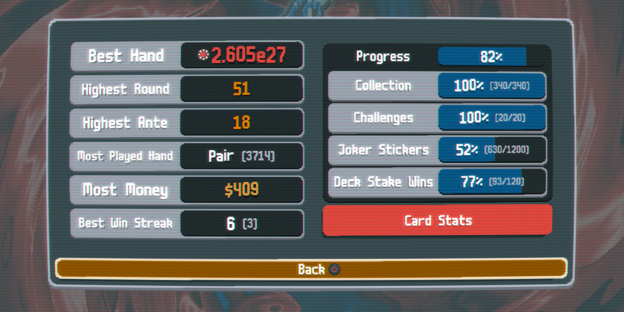 First, there has been some satisfaction to getting these things. If I do something difficult, it is nice to see the game recognize it. Collecting all of the jokers, tags, editions, vouchers, planet cards, tarot cards, and spectral cards was one such achievement. I didn’t have to go all that far out of my way to get it and it didn’t take a ridiculous amount of time to obtain.