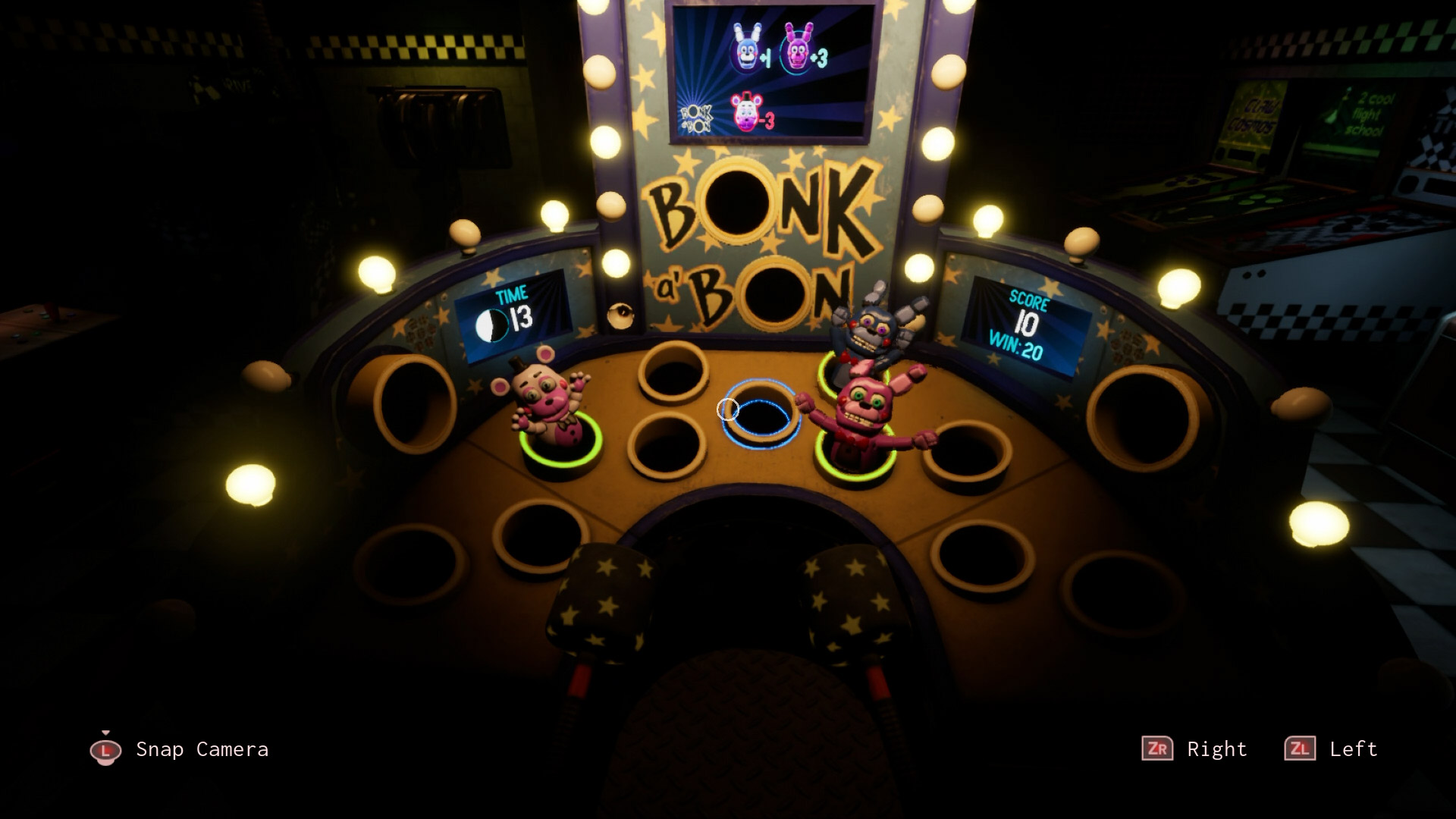 13: Bonk a’ Bon & Bonk a’ Bon: Bonus Round – I’m combining these two, as they’re pretty much the same. This is just a whack-a-mole game. Hit the Bonnies (pink gets you more points than blue) and don’t hit Helpy. Soon enough, Plush Baby will be added, who requires three hits and will jumpscare you if you take too long to get rid of her. Make sure you keep up with them, as there can even be two at once! You need to get a certain number of points for each of the three rounds, which can be tough, but at least Plush Baby grants you extra points. The Bonus Round is pretty much the same, with the addition of eyes that appear later to distract you. Just make sure you don’t hit Glitchtrap in round 3, or you’ll need to enter a code to get the game working again. The Bonus Round is just an extra round to get points and doesn’t even feature any Plush Babies! It can be rather stressful to hit enough Bonnies in time, especially since in flat mode, you can only hit one target at a time, making the second mallet redundant. This is the only level in the game that really makes my hands shake!