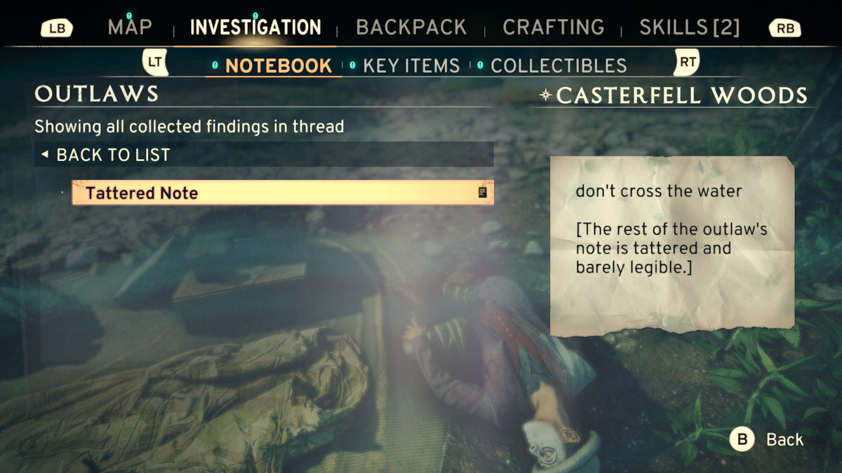 Any comparison between Atomfall and Fallout end at “post-apocalyptic.” (Once I got into the game, it reminded me far more of the likes of Dishonored.) Atomfall is a first-person action-survival-resource management game. There’s nothing very RPG-y about it, save for, perhaps, a little bit of skill-building. Players are mostly presented with managing limitations. The players’ backpack can hold only twelve swappable items total, which includes weapons. Four of those slots are devoted to two-handed weapons – rifles, shotguns, bows, large axes, and the like – and the remaining eight are for small weapons, throwables, food, bandages, and “medicines.” There are three additional “special” item backpack slots that will fill up when players find said “special” items, and there are separate but also limited inventories for crafting materials and ammunition. Finding stuff to pick up and use isn’t a problem – the world is littered with everything players need to survive – and helpfully, there’s a “stash” system in place (though its access points are few and far between) that players can use to lighten their loads.