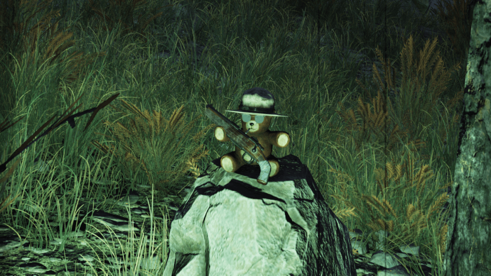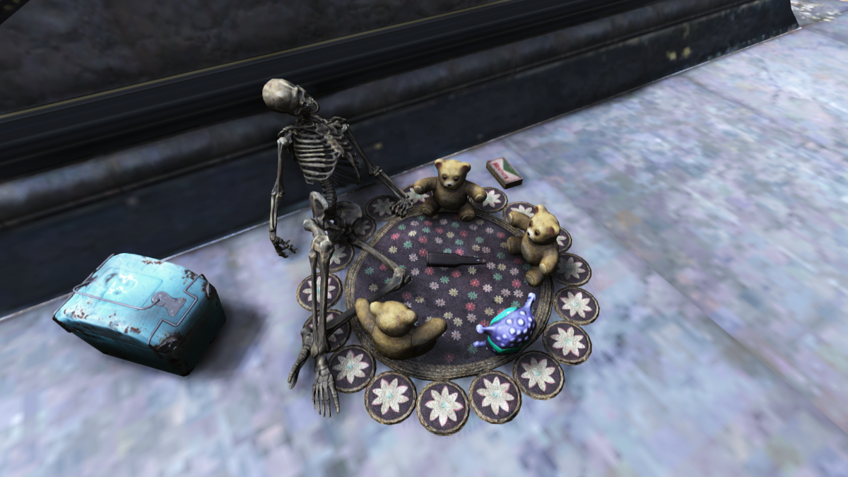 For my first “Sneaky Secrets” post this month, yes, I’m talking teddy bears! When one is traveling around any of Bethesda’s big RPGs, there’s so much to take in, it can be easy to miss odd, unusual, funny, and/or bizarre scenes strewn about the landscapes that tell their own stories. Fallout 4/76’s skeletons are good examples, as they are often placed in ways that demonstrate what humanity was doing when the bombs fell, from fishing to watching drive-in movies to herding people into a vault. Fallout 76 takes this setup a step further with its own little secret scenes (some more secret than others) showing teddy bears, and sometimes various other toys, in various…um…states of being? I’m not sure how to best put it, but you know it when you see it! As I don’t have much else to do, per se, in Fallout 76, seeking out these weird vignettes has become something of a pastime. Whenever the mood strikes, I’ll pick a spot on the map, make sure my camera has film (if I want to class things up a little in Photo Mode), and set off to explore solely to uncover the secret lives of these rascally bears in the West Virginia wilds. Here are just a few that grace my screenshot museum.