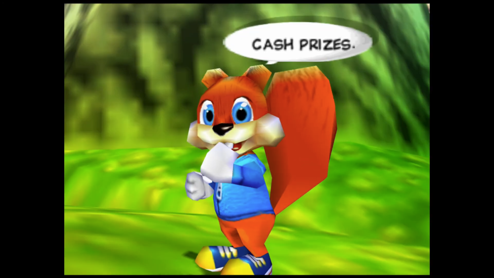 In the pantheon of 3D platformers, Rare’s Conker’s Bad Fur Day is a bit of an outlier. It has the bones of an exploration game with the muscle of a puzzle-platformer and the brains of an action-platformer. But its most noticeable departure from tradition has to do with collecting. Unlike its most comparable titles (Banjo-Kazooie, Super Mario Odyssey, etc.), Conker’s Bad Fur Day lacks collectibles. One could call its health-giving chocolate bars and life-giving squirrel tails “things to collect,” but outside of those, there are no items strewn about Conker’s world that one must gather up en masse.