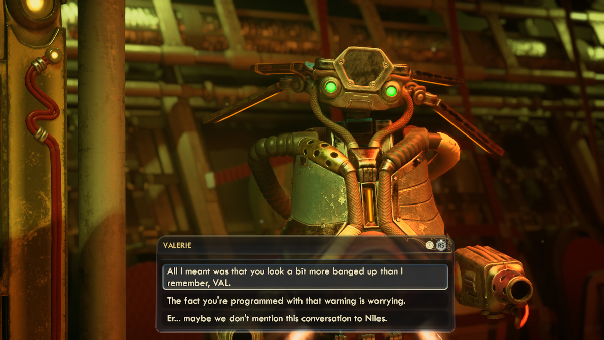 This segues nicely into the not-so “woohoo” portion of my ramblings, because the first bone I have to pick with The Outer Worlds 2 is the persistence of skill checks. Truth be told, Lila was not my first character.* In fact, I started out with a witty, dense, roustabout named Lorin. She seemed like a good time until I quickly learned that my choice of her perks was terrible and very unhelpful as far as progression went. After I put Lorin through the tutorial mission in which she missed out on a few key skill checks, I sent her to the recycle bin and came out on the other side with lawbringer Lila who had some engineering and further smarts under her belt. Hindsight being 20/20, I don’t think it spoils too much by saying that newcomers almost have to invest in some combination of engineering, lockpicking, and speech to fully engage with the game’s various systems, though the game would never say so. (Because guessing is so much more fun that roleplaying, isn’t it? No.) The game’s skill and perk systems are more streamlined than they were in the first game, but they are still not great, especially the skills. Not having the right skill at the right time really puts a dent in engagement. Now, I get that the game isn’t designed for one character to be an all-stop shop like in a Fallout game, but the way Obsidian has set about with skills and hiding content behind them is unsavory, to say the least. I’ve already found myself locked out of a couple scenarios because of my decision to put skill points into combat-based options over character-based ones.