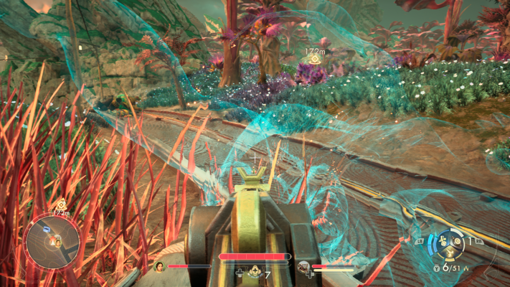 Then again, perhaps the joke’s on me, because speaking of combat, the other “this stinks” issue is aiming. I don’t recall this being a major issue in the first game, but it is wildly bad in the second game. I hadn’t thought to set up Lila as a melee character, but I’m thinking that may have to be the route I go if I can’t learn to tolerate aiming as it is or figure out how to properly adjust the settings. For the moment, targeting enemies with guns feels broken, as the sights jump around the screen when multiple enemies appear. I’ve ended up mostly shooting from the hip in the general direction of enemies because of this. It works fine…sometimes. The more enemies that show up the worse the combat gets, and while I like my companions, I’m not sure how much help the really are in combat. One companion does have a useful aggro ability, but its cooldown is too long, and the character is too squishy to be a proper tank, at least for the moment. The other two companions have healing capabilities, but they don’t go very far, especially when the enemies become really tough. This is all to say that I like to be able to fend for myself in games, and The Outer Worlds 2’s wonky gunplay is making that rather difficult.