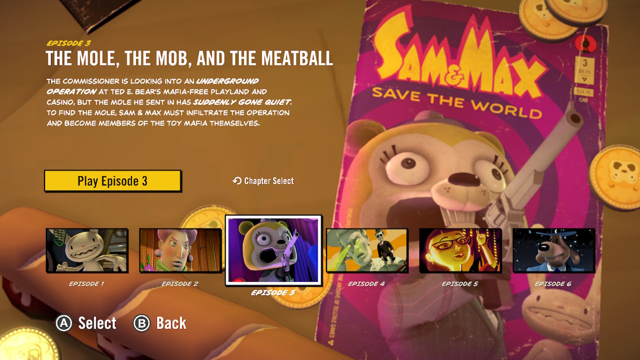 Lede image from igdb.com presskit for Sam & Max Save the World; in-line images captured by author during Nintendo Switch gameplay of Sam & Max Save the World [remastered] (all © Skunkape Games).