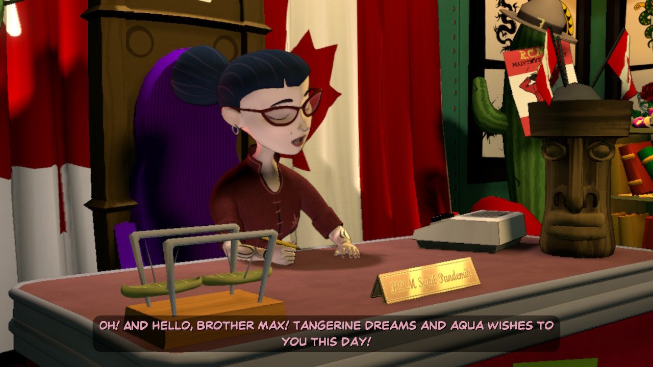 Granted, the game’s awkwardness is subjective, and it stems from one’s predilection for piecing together the game’s “logic.” As I said at the start, I had a tough time with this in the original Hit the Road. The idea throughout the game is that Sam and Max gather up various items to use at specific times and places to trigger specific actions, thereby progressing the story. It’s obvious when the right connection is made, but figuring out how to make those connections in the correct order is the tough part. Sam could sometime consult Max for a hint, but these hints ranged widely from on-the-nose to completely oblique. More than once I found myself totally stumped as to what to do next; this turned these forty-five minute episodes into days-long dramas. Success occurred through both trial and error and Internet searches. When I finally managed to see the duo save the world from a terrible fate, it was a battle hard-won, but one I’d tackle again in a heartbeat.