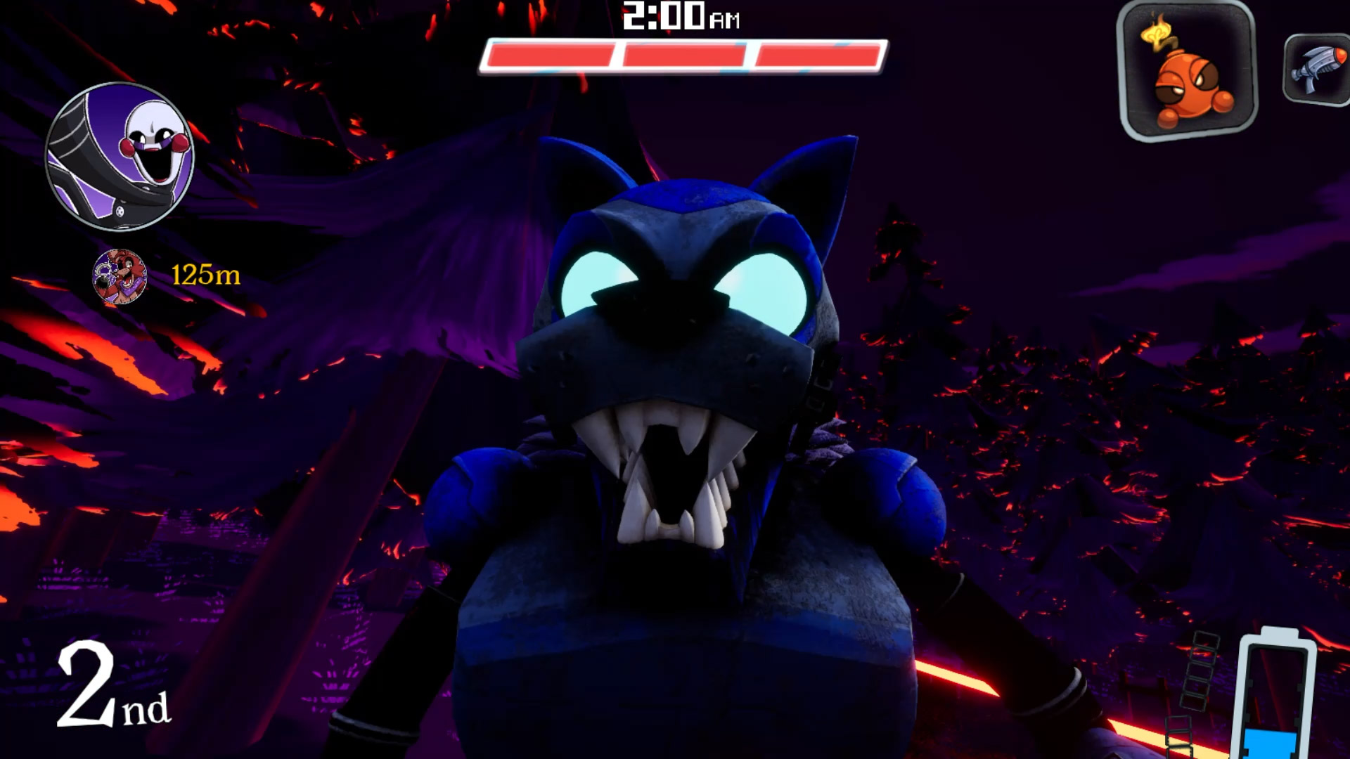 FLAF is pretty much your basic kart-racing game, like Mario Kart. As you race around the track, you get items you can use to help you or sabotage other players, like a Fazerblaster to shoot a laser at other racers or a cupcake that seems to provide a boost. Throughout the race, the game will switch back and forth between day time and the Night Shift, during which everything gets darker. There is also a battery meter that drains when you use items, and I read that it constantly drains during the Night Shift. If your battery runs out, an endoskeleton (it looks more like a wolf to me) will jumpscare you, which loses you a bit of precious time. The whole battery mechanic is a good way to distinguish this game from other kart racers and to add that special FNAF touch. Though, I’ll admit I wasn’t even aware of how this mechanic worked while I was actually playing the demo, and I only learned about the rules later when preparing for this review. (I somehow didn’t notice my battery draining at night…and I didn’t make the connection between that and my one jumpscare.)