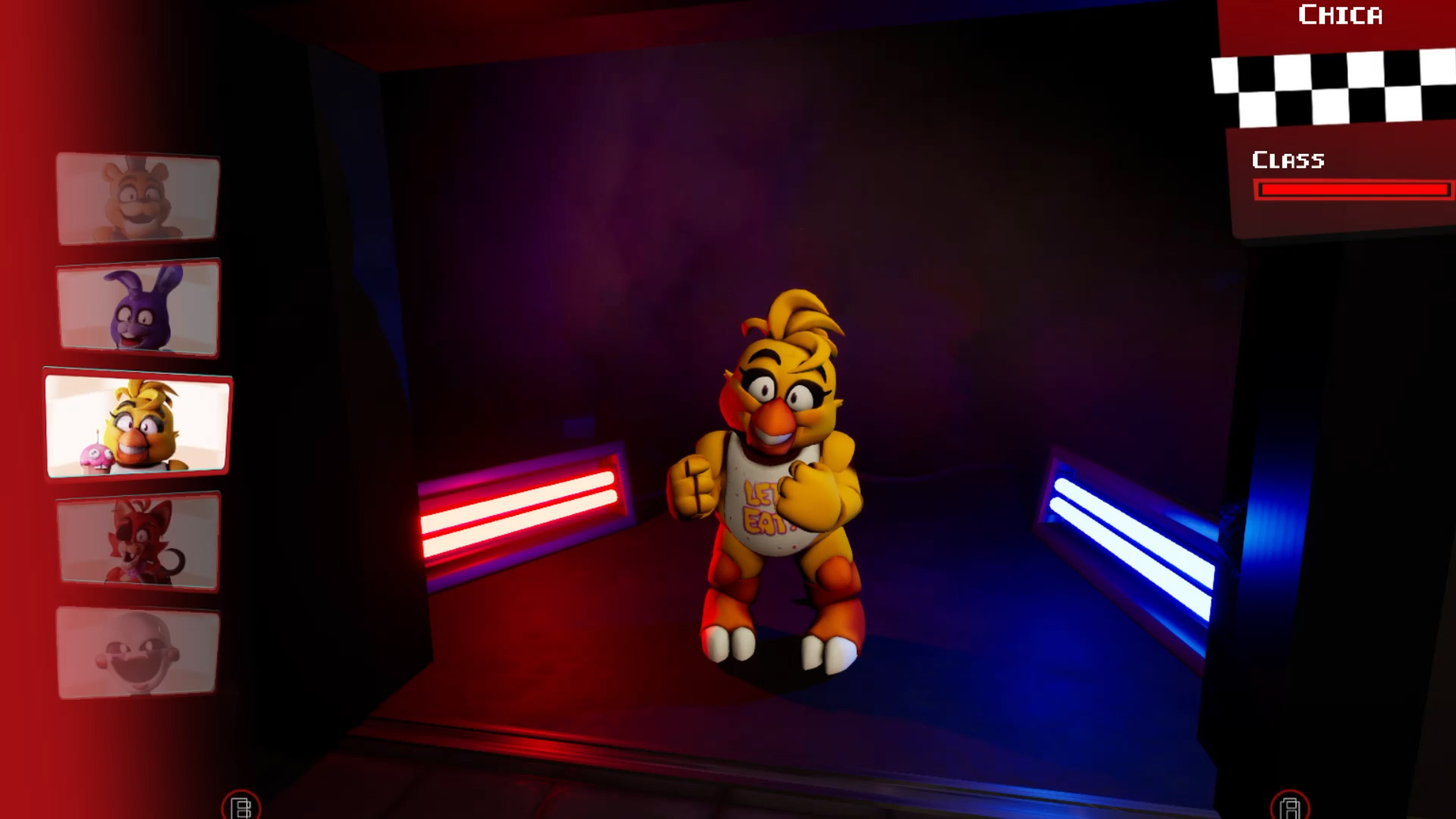 The demo has a decent selection of characters, including the original quartet from the first game, the unique newcomers from FNAF 2, and Springtrap from FNAF 3. I was not really a fan of a lot of the character designs, though. Chica is really cute, and Freddy, Foxy, and the Puppet look fine. But I didn’t like the designs for anyone else. A cute aesthetic for this game is a good idea, but some of these designs need some adjusting in order to make them more appealing. And again, the “endoskeleton” just looks like a floating wolf with no legs, so…not only is it not really recognizable as to what it’s meant to be, it’s also not very intimidating in appearance.